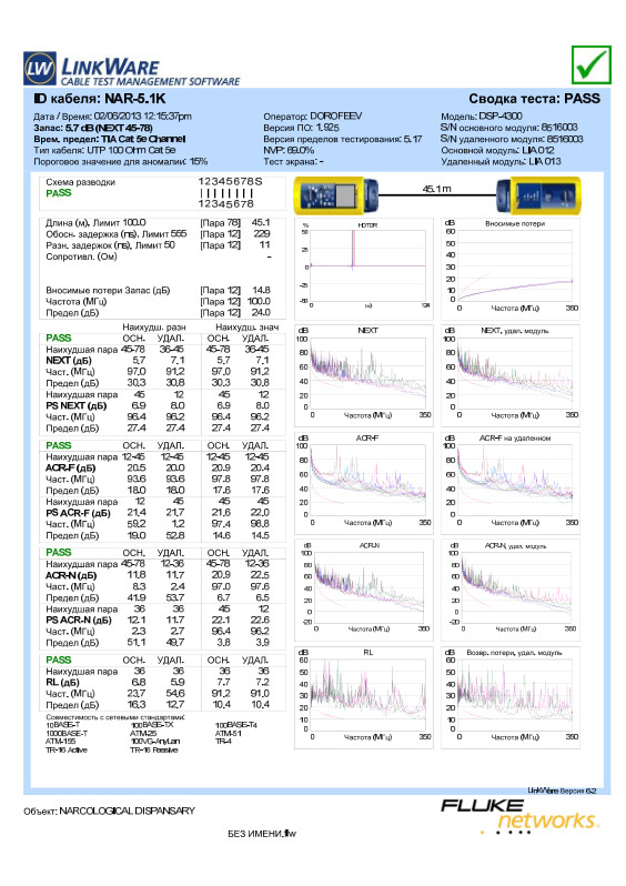 Тестирование проводится кабельным анализатором компании Fluke Networks. Прибор ежегодно проходит процедуру поверки в лаборатории Fluke Networks.